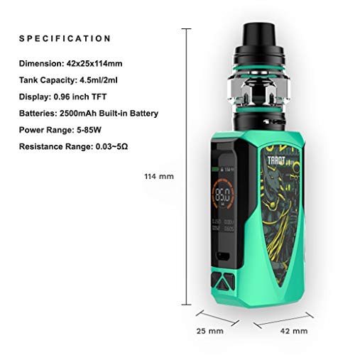 Wichtige Merkmale Tarot Baby: Akkukapazität: 2.500mAh, Ausgabemodi: Smart VW (H/N/S) / VT (SS, NI, TI) / TCR (M1/M2) /CCT / CCW / VV / CCV / SP / BYPASS, Ausgangsleistung: 5 Watt – 85 Watt, Widerstandsbereich: 0,03 Ohm – 5 Ohm, 0,96 Zoll TFT Farbdisplay, Maße: 42 mm x 25 mm x 70,3 mm